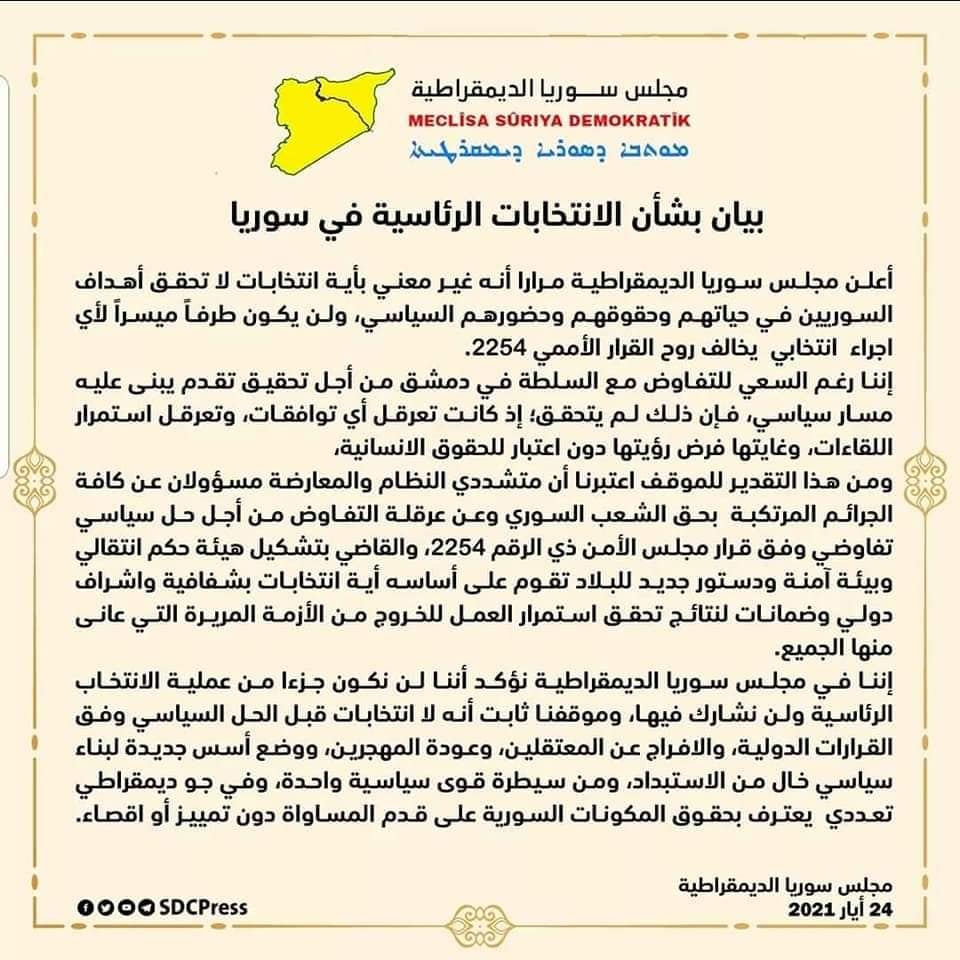 وفي البيان نفسه الذي حصلت وكالة انباء أسيا على نسخة منه ورد أن سلطة الأمر الواقع الكردية ستمنع اجراء الانتخابات الرئاسية السورية في مناطق سيطرتها.