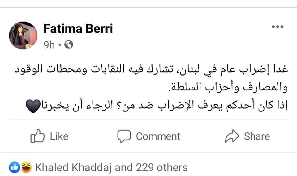 واما الاعلامية فاطمة بري فكتبت تقول إذا كان أحدكم يعرف الإضراب ضد من؟ الرجاء أن يخبرنا"