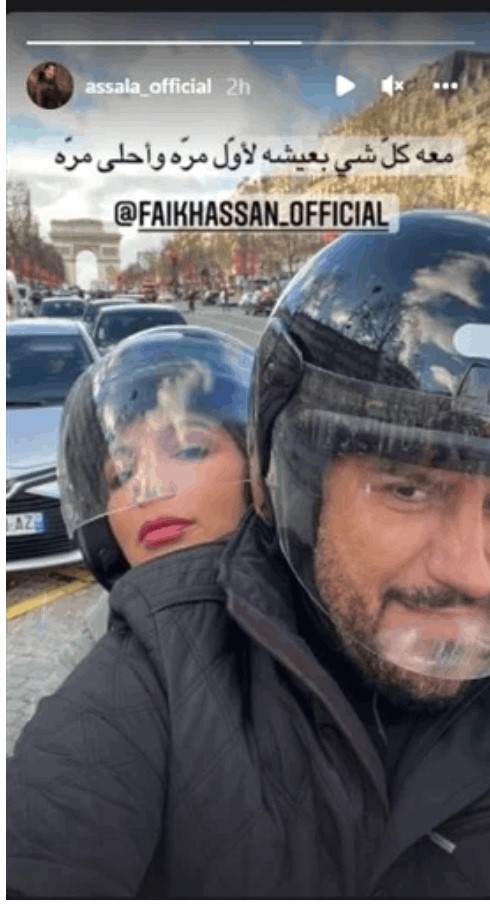 وظهرت أصالة مع فائق حسن وهما يستقلان دراجة نارية ويرتديان خوذة.