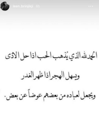 وتحدثت لين هذه المرة عن "الغدر" حيث نشرت عبر "ستوري" حسابها الرسمي على موقع التواصل الاجتماعي "انستغرام" تعليقاً عن الغدر وقالت: "الحمد الله الذي يذهب الحب إذا حل الأذى ويسهل الهجر إذا ظهر الغدر، ويجعل لعباده من بعضهم عوضاً عن بعض".