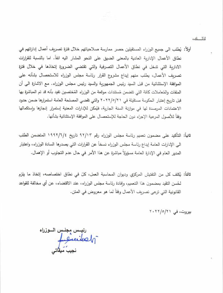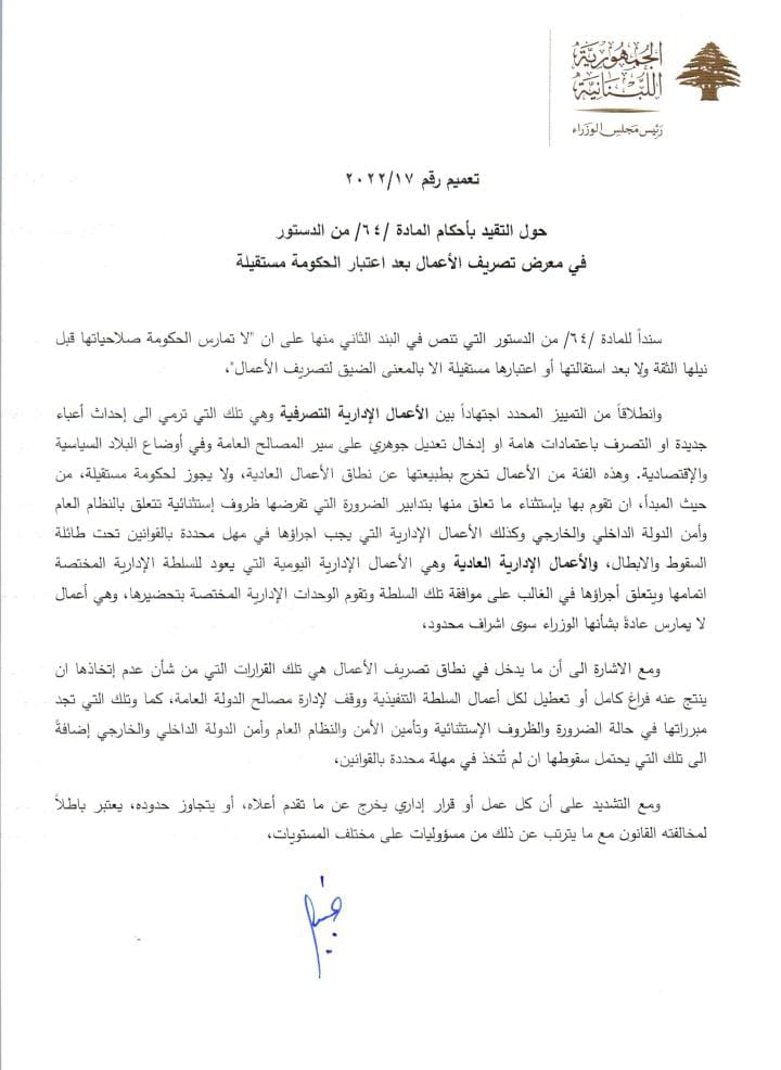 اصدر رئيس حكومة تصريف الاعمال نجيب ميقاتي تعميما بشأن التقيد بأحكام المادة /64/ من الدستور في معرض تصريف الأعمال بعد اعتبار الحكومة مستقيلة.
