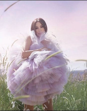 وإرتدت إليسا التي أطلت من الحديقة، فستاناً باللون البنفسجي الفاتح، من الريش، قصير وواسع، وبدت بكامل النعومة.