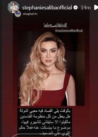 وفي المنشور من خلال "ستوري" على حسابها على "إنستغرام" تعبر صليبا عن استيائها من القصة التي حصلت معها، وتقول: "بالوقت يلي الفساد فيه معبي الدولة، هل يعقل من كل منظومة الفاسدين ما لقيتوا إلا ستيفاني تتشهرو فيها؟".