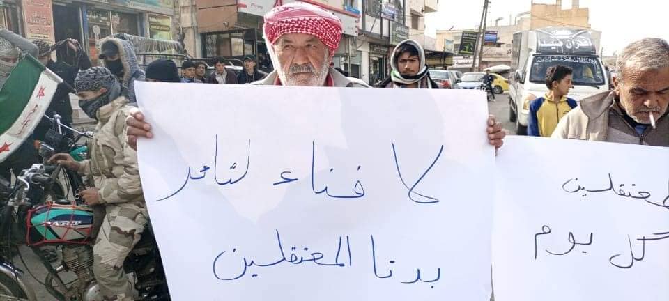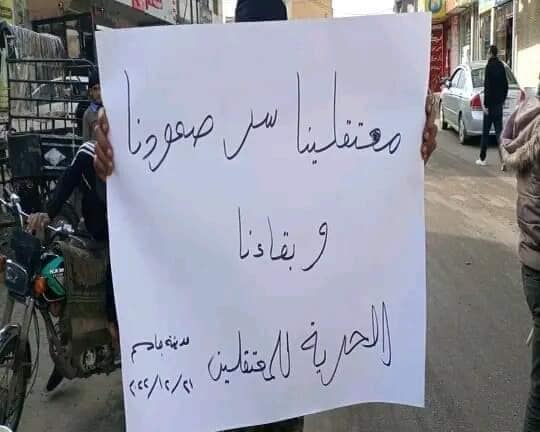 تجمع العشرات من أبناء مدينة جاسم بريف درعا، اليوم الأربعاء 21كانون الاول 2022، في الساحة العامة، مطالبين بفك أسر جميع المعتقلين في السجون السورية، وسط ترديد شعارات مناوئة للحكومة.