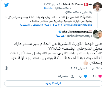 وكتبت معلقة:"هلق فهمنا الكوارث البشرية من الحكام بليز مستر مارك ممكن تشرحلي الطبيعيه كيف؟؟؟ تانياً حضرتك شو رأيك تلتهي بسفراتك وتحل مشاكل لبنان الغالي وشعبه اللي عطاك ثقة وبعدين بنقعد ع طاولة حوار وبنحكي ".