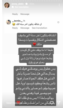وأضافت عبدو: "طبعا أنا ما بوقف على كل كومنت، أو مسج بشع بيشبه صاحبو، وطبعا هيك نوعية زبالة أول شي بعملو هوي بلوك، بس عطول بس يوصلني هيك شي بسأل حالي هل نحنا صرنا بأخر الدني؟ هل هلقد صار فيها الحياة ناس بشعة وحقودة وسوداوية؟"