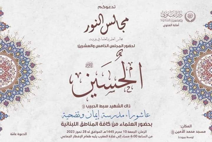 لم تبصر الدعوة التي وجهها أمين عام دار الفتوى الشيخ أمين الكردي لإحياء ذكرى الإمام الحسين (ع) النور، حيث أعلن في بيان أن "موعد مجلس النور الخامس والعشرين والذي كان سيُعقد حول سيدنا الحسين رضي الله عنه ذاك الشهيد سبط الحبيب ﷺ في مسجد محمد الأمين ﷺ إلى موعدٍ لاحق، وذلك حرصاً منا على إبراز مناقب وأخلاق وعظيم شهادة هذا الإمام العظيم رضي الله عنه ابن بنت رسول الله ﷺ وتفويتاً للفرصة على من يحاولون استغلال هذا المجلس العلمي وتحميله غير مقصوده وأهدافه من جهات متناقضة في واقع الأمر".