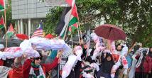 كما حمل المتظاهرون لافتات تنادي بـ "مقاطعة إسرائيل" و"الحرية لفلسطين" و"وقف الإبادة الجماع ...