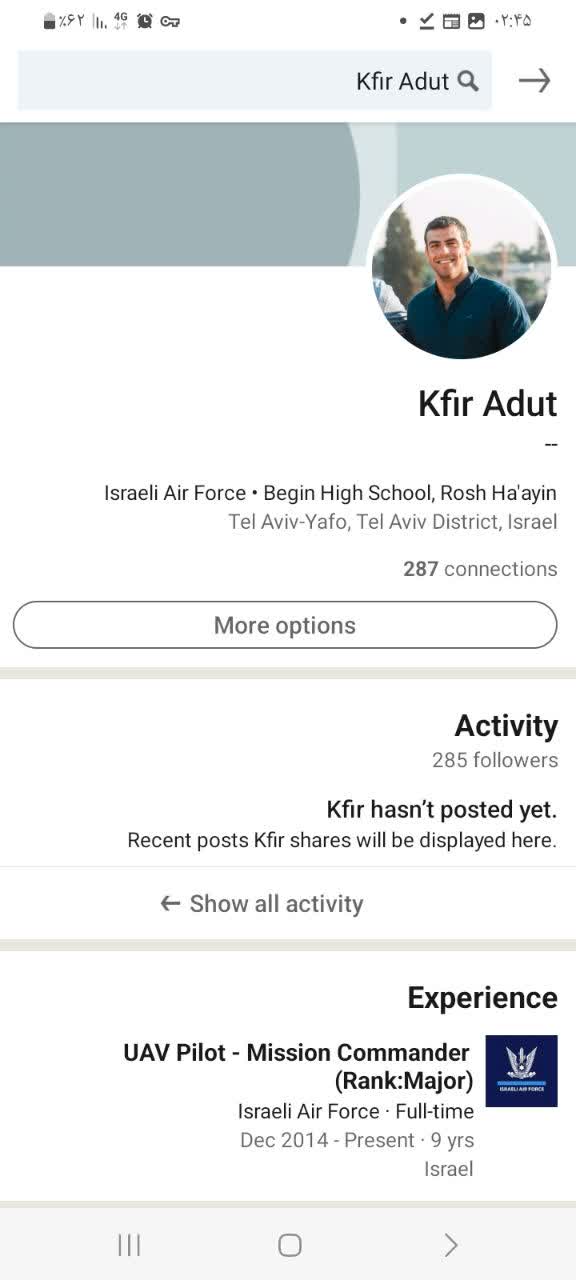 خامساً: "كفير ادات" (Kfir Adut) هو رائد في سلاح الجو الإسرائيلي، طيار لمقاتلة وطيار بدون طيار ويعيش في تل أبيب، وقد أشاد به رئيسه اللواء في يناير 2020 لأدائه الاستثنائي.