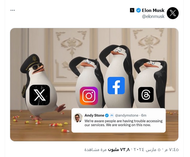 ونشر ماسك صورة على حسابه الرسمي على منصة "إكس" لأربعة بطاريق، 3 منها تمثل "فيسبوك" و"إنستغرام" و"ميسنجر"، وهي تلقي التحية للبطريق الرابع، والذي يمثل منصة "إكس".