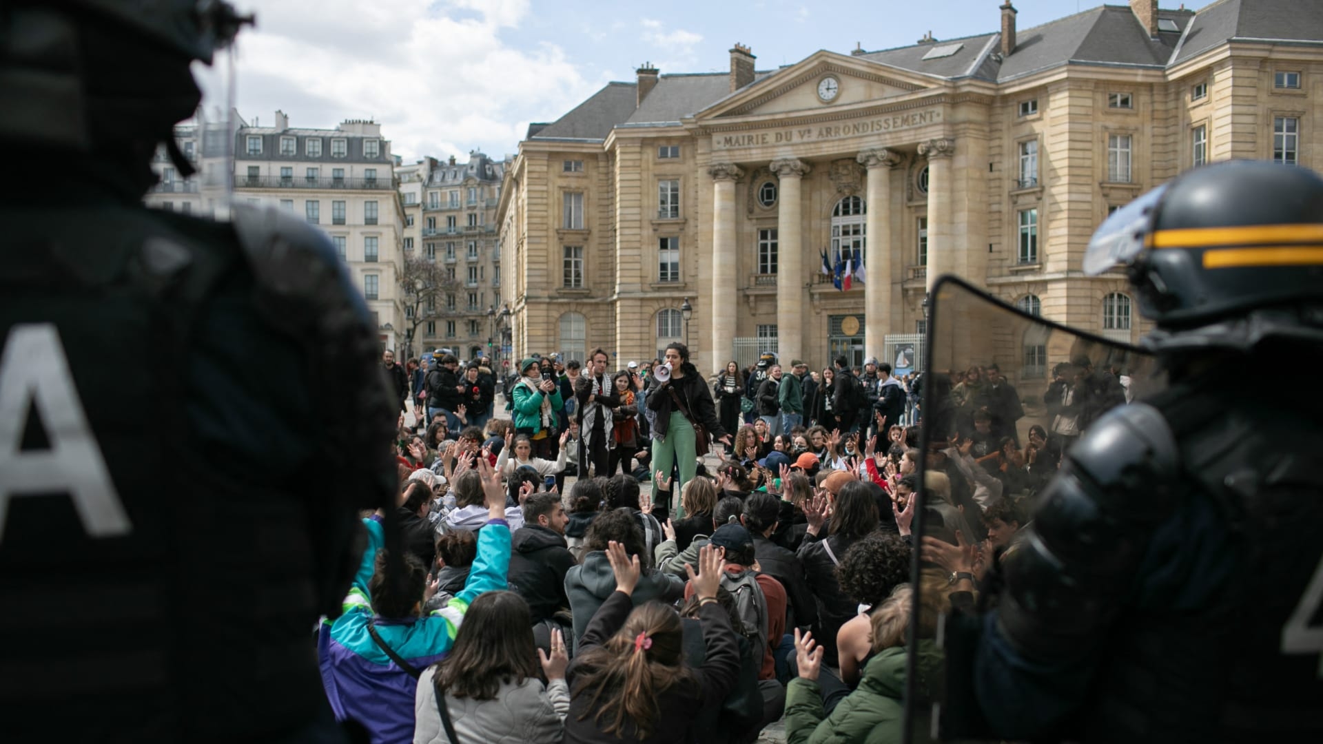 واعتدت الشرطة الفرنسية بالضرب على عدد من الطلاب المحتجين أمام جامعة العلوم السياسية في باريس، وحاولت تفريق المحتجين بالقوة.