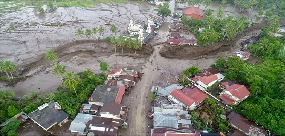 ووقعت المأساة في إقليمي أغام وتاناه داتار في غرب جزيرة سومطرة، حيث هطلت أمطار غزيرة طوال ساعات على المنطقة، متسببة بفيضانات مفاجئة وسيل من الحمم البركانية الباردة مصدره جبل مارابي، وهو جبل بركاني يقع في الجزيرة.
