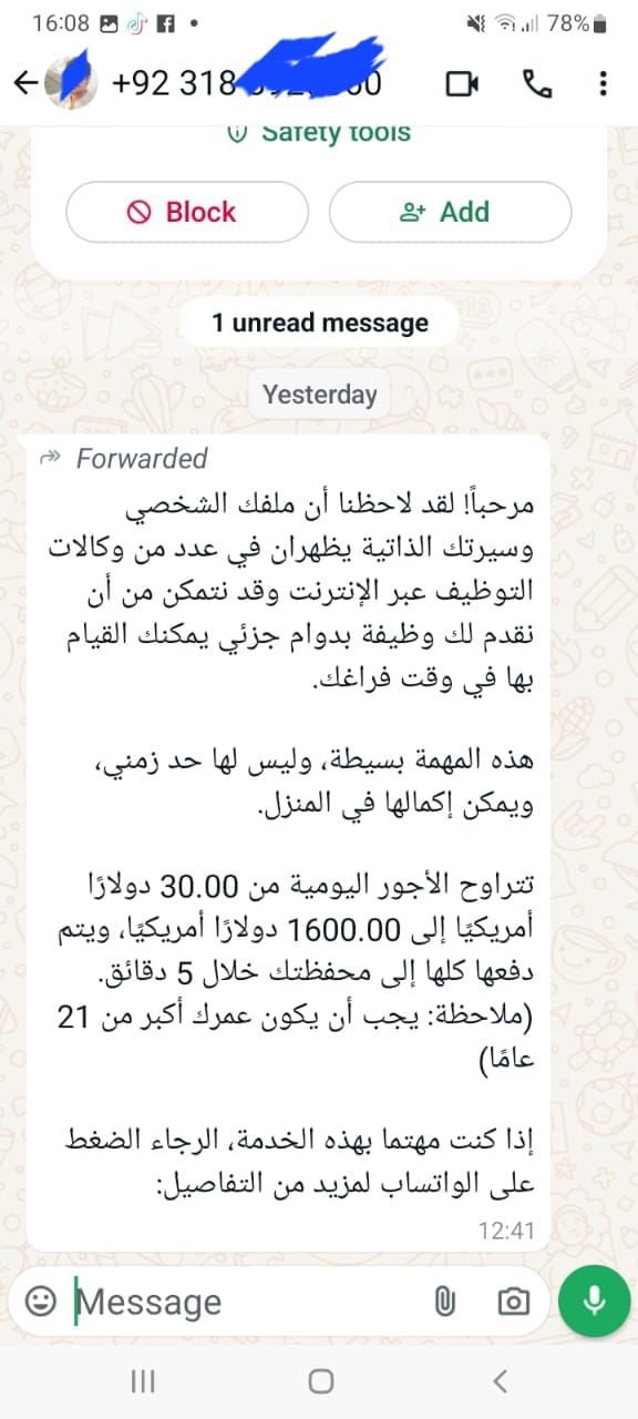 تصل رسائل من المخابرات الاسرائيلية منذ بداية الحرب على غزة الى عدد كبير من اللبنانيين تحاول استدراجهم بخدعة الوظائف عبر الانترنت وبالاغراءات المالية الكبيرة والسهلة. وفي الصورة نسخة عن بعض الك الرسائل والرقم الهاتفي المستعمل يبدأ ب +92