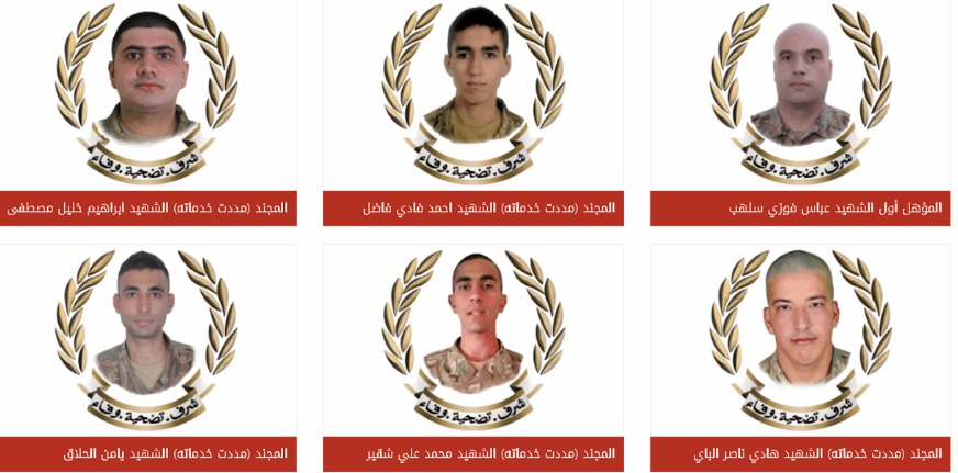 الجيش نعى رسميًا المؤهل أول عباس فوزي سلهب، والمجندين أحمد فادي فاضل، وإبراهيم خليل مصطفى، وهادي ناصر الباي، ومحمد علي شقير، ويامن الحلاق، مشيرًا إلى أنهم سقطوا أثناء أداء واجبهم الوطني في تفكيك أسلحة وذخائر مخلّفة عن الصراعات.