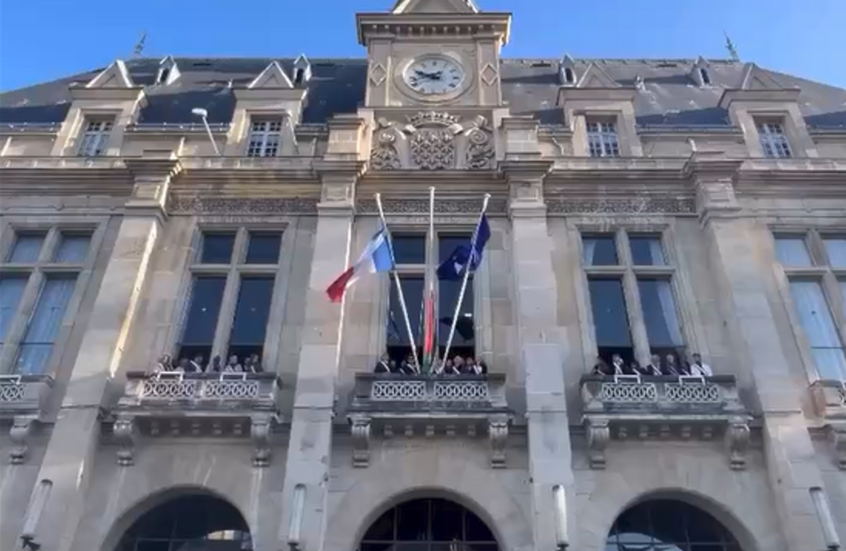 وتم رفع العلم عند الساعة التاسعة وأربعين دقيقة بحضور رئيس البلدية الاشتراكي ماتيو هانوتين، والسكرتير الأول للحزب الاشتراكي أوليفييه فور. ووصف هانوتين اللحظة بأنها "تاريخية"، قائلاً إن المبادرة ليست عملاً نضالياً طويل الأمد، بل تعبير عن اللحظة التي تعيشها فرنسا مع قرار الاعتراف.