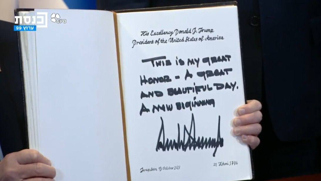 في مشهد يحمل دلالات سياسية عميقة، دوّن الرئيس الأمريكي دونالد ترامب عبارة “يوم عظيم وجميل.. بداية جديدة” في سجل الضيوف بالكنيست الإسرائيلي، قبيل إلقاء كلمته أمام النواب، في زيارة تُعد الأولى له إلى تل أبيب منذ إعادة انتخابه رئيسًا للولايات المتحدة.