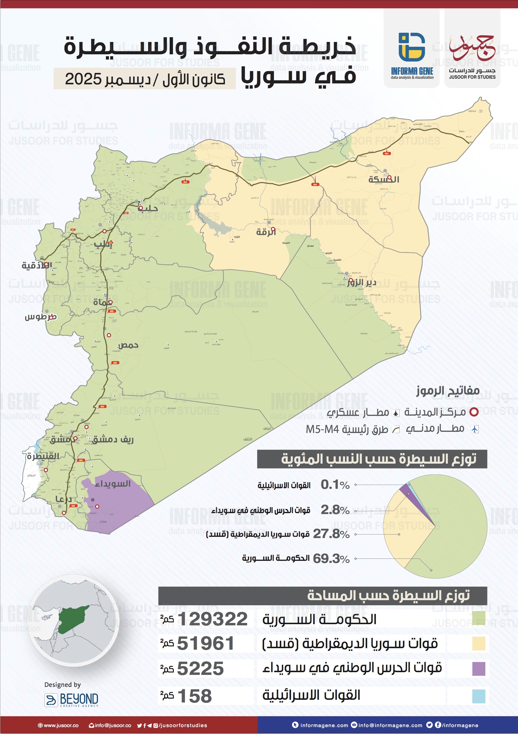 تظل الحكومة السورية الجهة الأكثر قوة على المستوى السياسي والجغرافي، حيث تسيطر على نحو 69.3% من مساحة البلاد، تشمل المدن الكبرى ومعظم البنى التحتية الحيوية والطرق الرئيسية. ومع ذلك، لا تمتلك السيطرة الكاملة على أربع محافظات رئيسية هي القنيطرة والسويداء والحسكة والرقة.