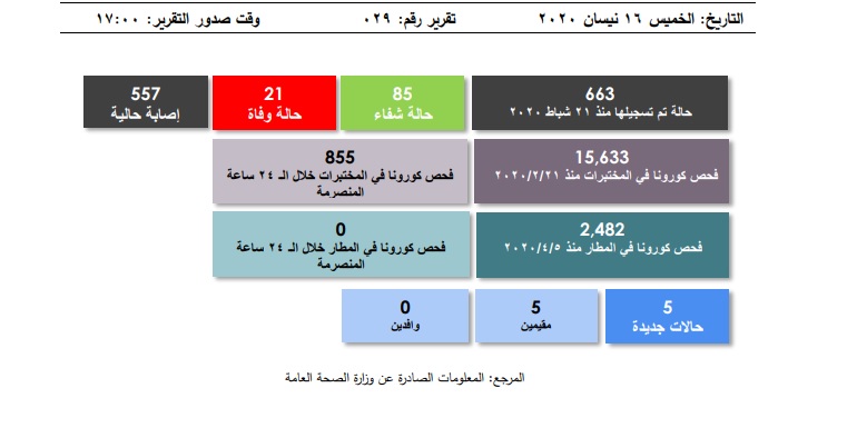 ووفق تقرير غرفة العمليات الوطنية لإدارة الكوارث في السراي الكبير، فقد بلغ عدد الإصابات بفيروس كورونا في لبنان 663 حالة، مع تسجيل 5 حالات جديدة من المقيمين، وذلك من أصل 855 فحصاً أجري في الساعات الـ24 الماضية. فيما استقر عدد الوفيات على 21 حالة، وعدد حالات الشفاء ارتفع إلى 85. وأشار تقرير غرفة العمليات إلى أنّ عدد الفحوصات التي أجريت بلغ 15633.