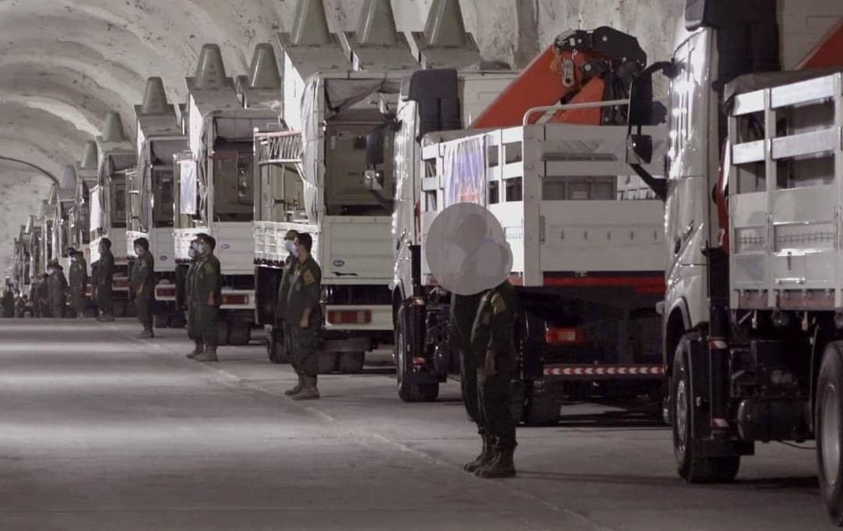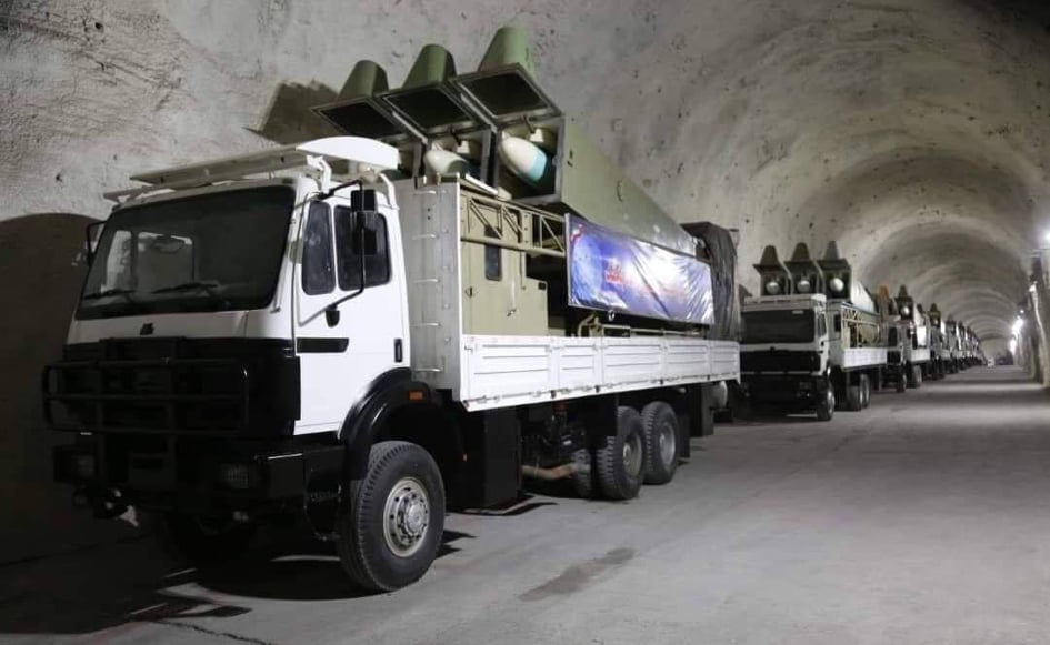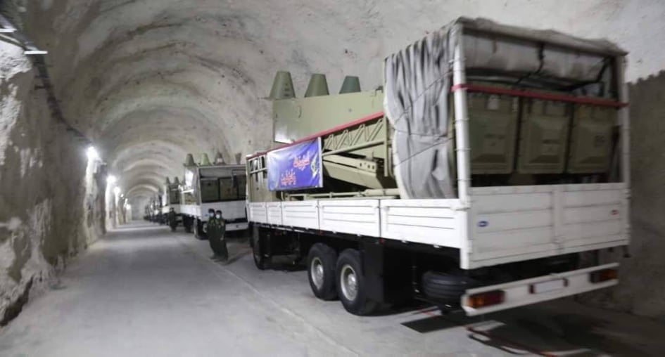وشوهدت عشرات الشاحنات العسكرية المجهزة بالأسلحة المضادة للسفن وهي تصطف على جدران الأنفاق تحت الأرض للقاعدة السرية.