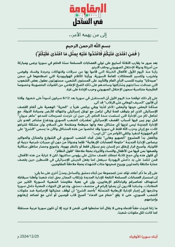وفي خطوة مثيرة للجدل، أصدرت مجموعة مشتركة بيانًا يحمل اسم "المقاومة في الساحل"، معلنة عن تشكيل قوة "مقـ.ـاومة مسلحة" تهدف لمواجهة الحكومة الجديدة في دمشق بقيادة أحمد الشرع.