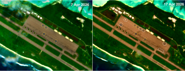 وتكشف صور أقمار صناعية التقطت في 17 أبريل 2026 عن زيادة في عدد الطائرات على مدرج القاعدة مقارنة بصورة بتاريخ 7 أبريل، حيث يظهر وجود ثماني طائرات إضافية، من بينها طائرة استطلاع وثلاث مقاتلات على الأقل، إلى جانب أربع طائرات كانت متمركزة سابقا في الموقع.