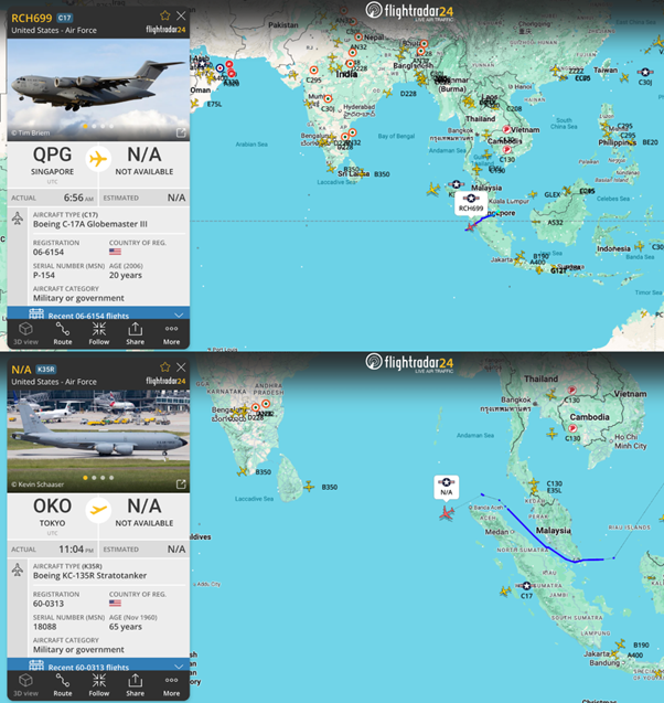 وفي 16 أبريل، رصد فريق مسبار عبور طائرتين عسكريتين أمريكيتين فوق أجواء سنغافورة باتجاه المحيط الهندي قبل إغلاق أنظمة التتبع، إحداهما من طراز KC-135 والأخرى C-17.