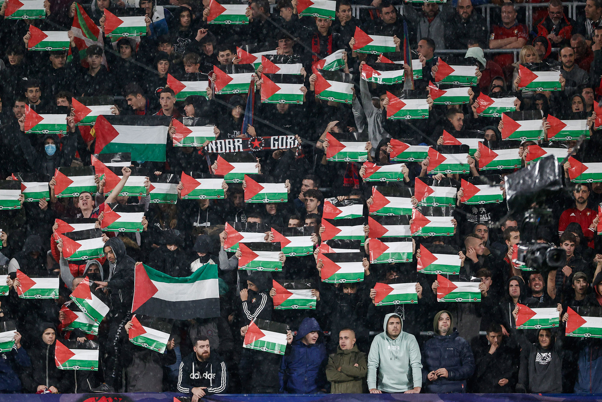 رفعت جماهير نادي أوساسونا الإسباني العلم الفلسطيني في مباراة الفريق مع نادي غرناطة في الجولة العاشرة من الدوري الإسباني، يوم الجمعة.