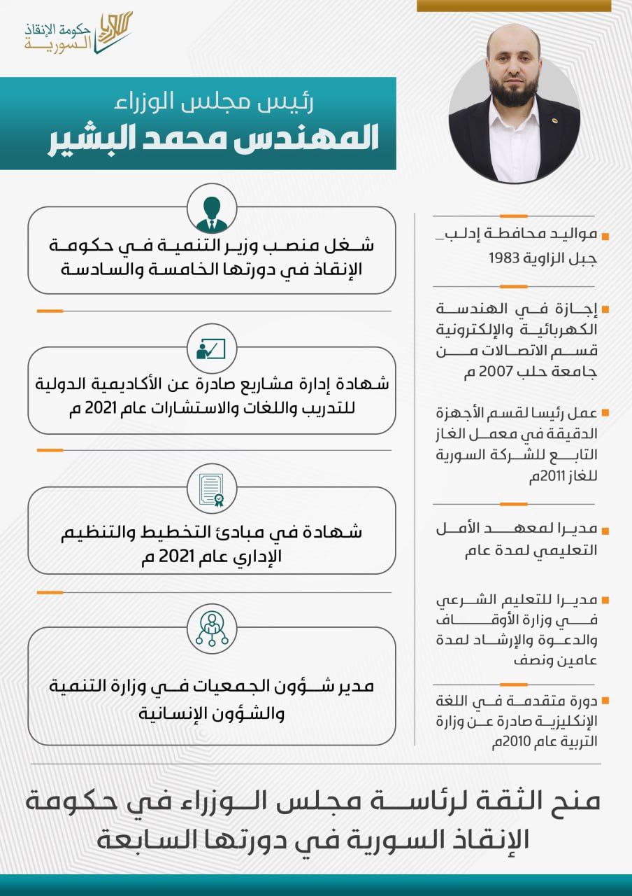 كان محمد البشير يشغل منصب وزير التنمية والشؤون الإنسانية في “الإنقاذ” في عامي 2022 و2023، وهو من مواليد عام 1983، من جبل الزاوية جنوبي محافظة إدلب.