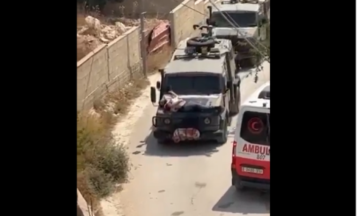 أظهر مقطع مصور بثته وسائل إعلام فلسطينية تقييد قوات الجيش الإسرائيلي لمواطن فلسطيني مصاب بمقدمة مركبة عسكرية أثناء انسحابها من مدينة جنين، السبت، بعد اقتحام دام عدة ساعات.