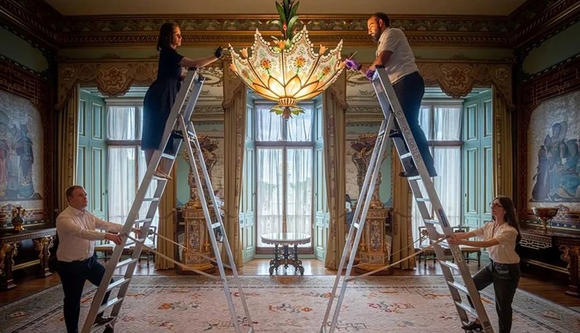 إلا أنهم وبالإضافة إلى إمكانية حصولهم على إطلالة من خلال الستارة الشبكية على الطريق المقابلة لواجهة القصر، يمكنهم كذلك الاستمتاع برؤية ثريا زجاجية من القرن التاسع عشر على شكل زهرة اللوتس جرى ترميمها حديثاً.