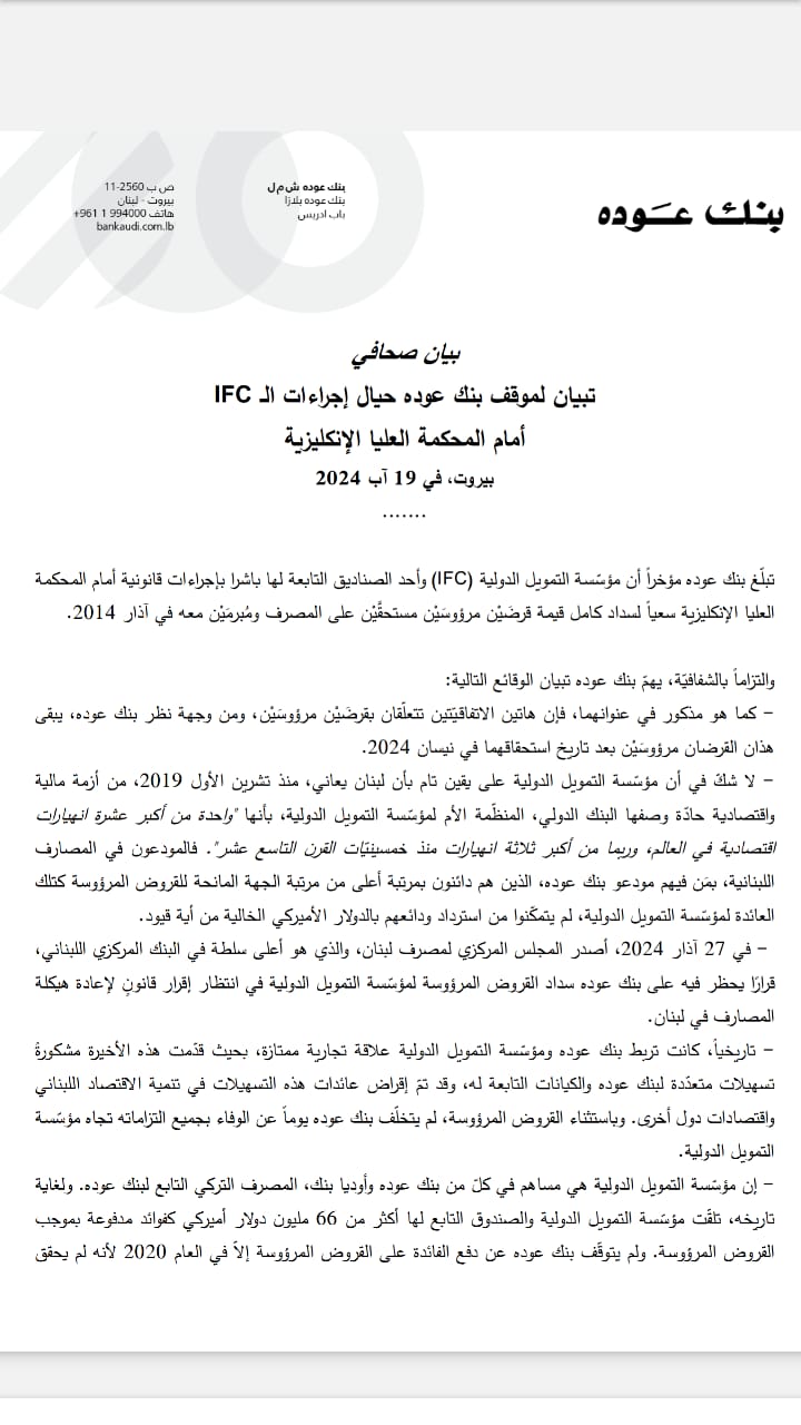 صدر عن بنك عوده البيان التالي، بشأن تبيان موقف المصرف حيال إجراءات الـIFC أمام المحكمة العليا الإنكليزيّة، وجاء فيه: