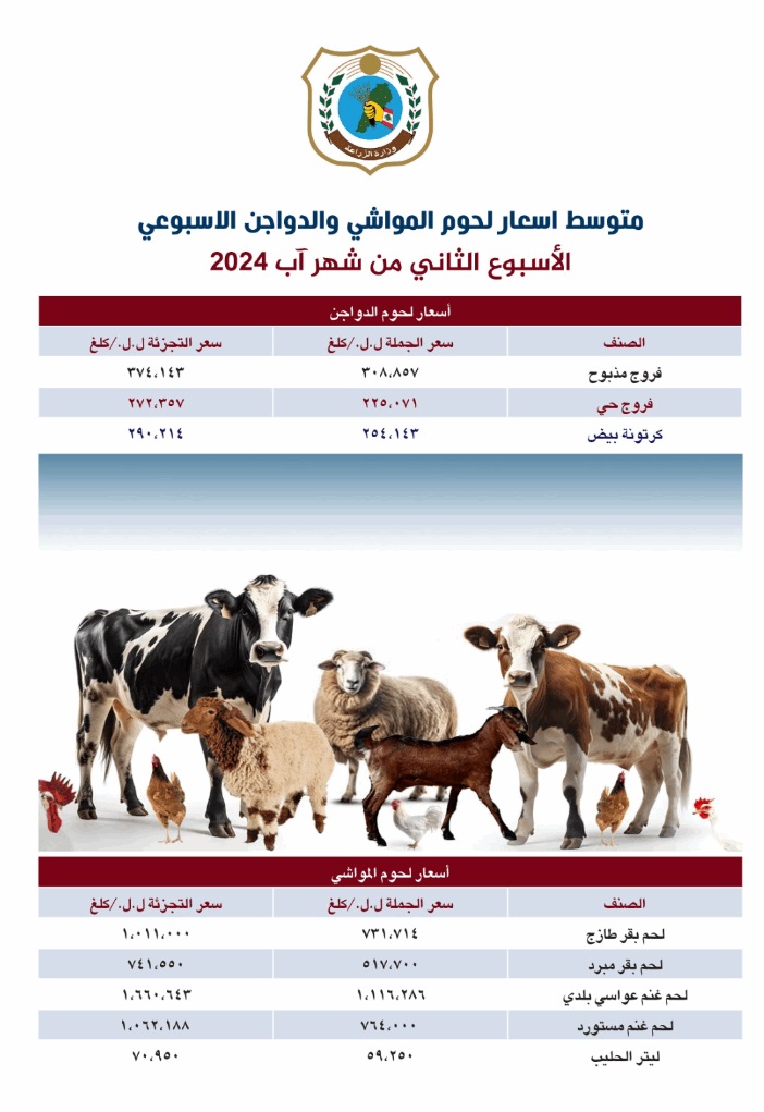 نشرت وزارة الزراعة متوسط أسعار الجملة والتجزئة للحوم والخضار والفاكهة والحليب خلال الأسبوع الثاني من شهر آب.