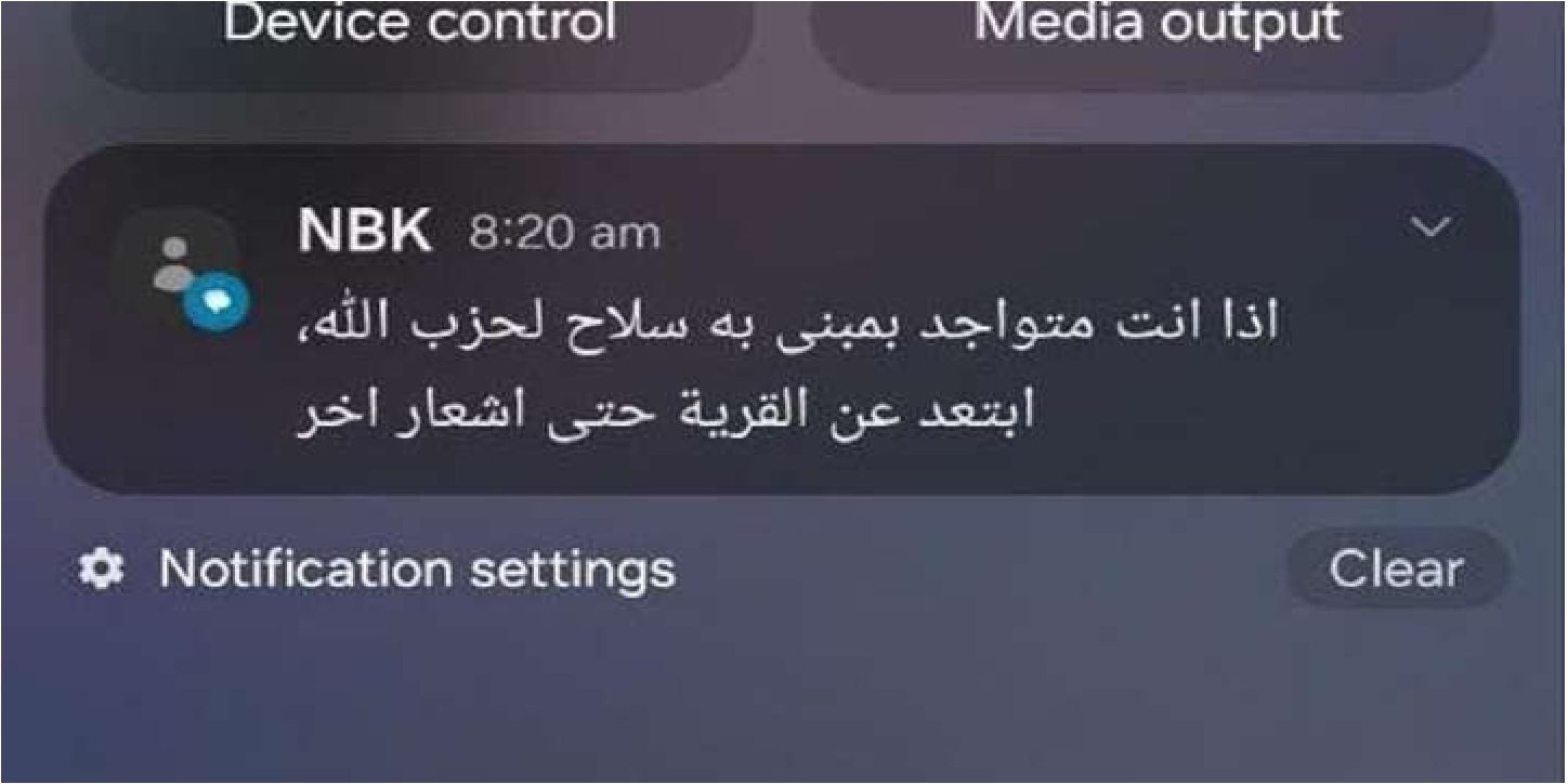 رسائل نصيّة قصيرة أو صوتيّة تصل إلى هواتف عدد من اللّبنانيّين، من قبل الجانب الإسرائيلي، تنصّ على الآتي: "إذا أنت متواجد في مبنى به سلاح لـ"ح زب ال له"، ابتعد عن القرية حتّى إشعار آخر.