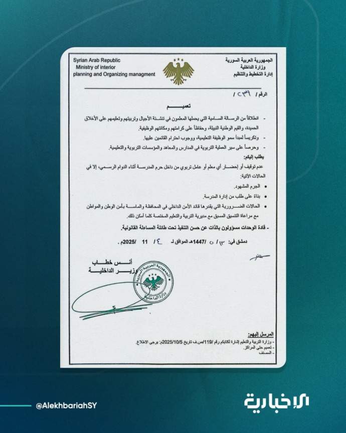 وأكدت الوزارة على مسؤولية قادة الوحدات في تنفيذ التعليمات تحت طائلة المساءلة القانونية، في خطوة تهدف للحفاظ على مكانة المعلمين ودورهم في العملية التعليمية ونقل القيم الوطنية والأخلاقية للأجيال الصاعدة.