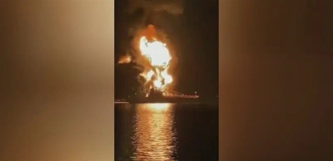 وأظهرت لقطات بثتها القناة مشاهد لسفينة تصاعد منها كرات نارية وأعمدة دخان كثيفة، فيما أكدت شركة الموانئ إنقاذ 38 شخصاً أحياء، مع استمرار البحث عن المفقودين.