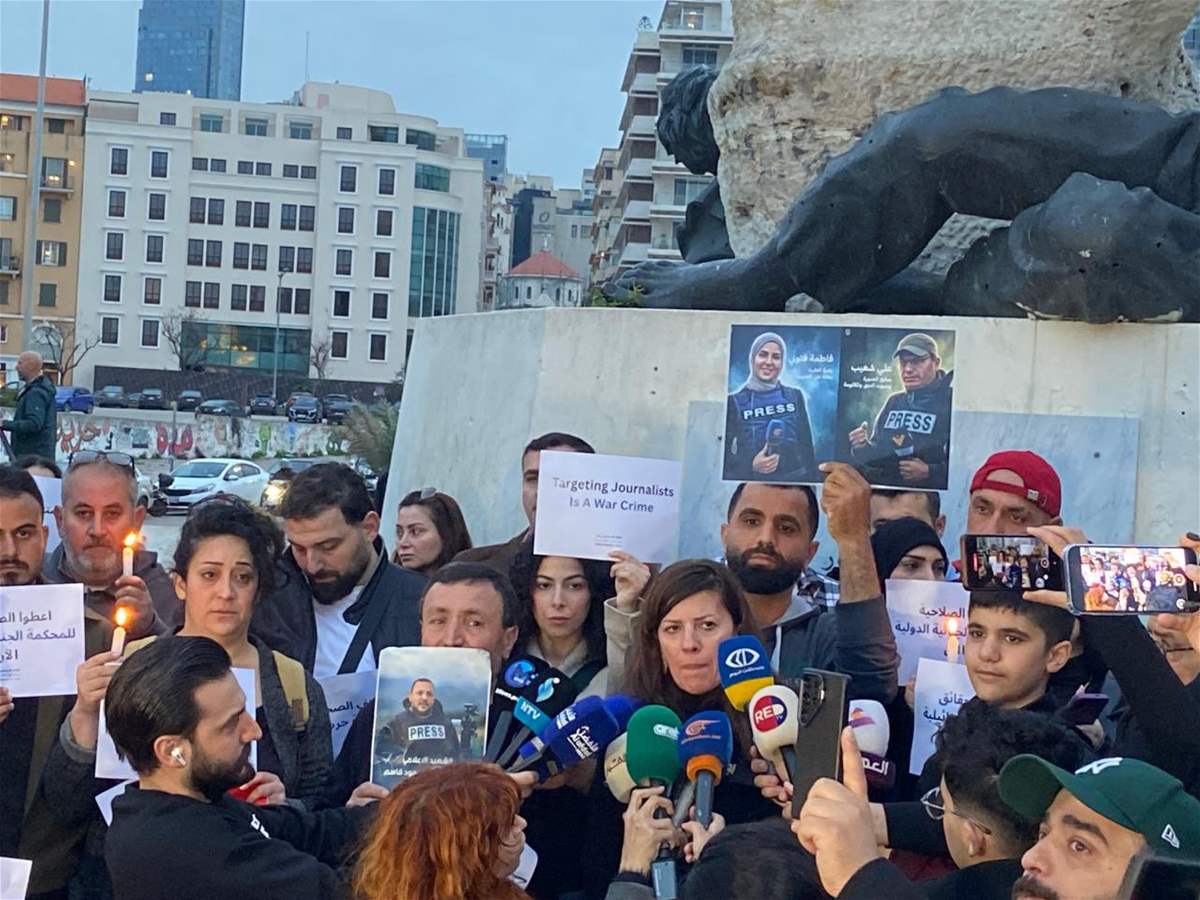 أقيمت وقفة احتجاجية في ساحة الشهداء بدعوة من اتحاد الصحافيين والصحافيات في لبنان، للتنديد باستشهاد علي شعيب وفاطمة ومحمد فتوني، وأكد المشاركون أنّ "الصحافة لا يمكن إسكاتها" ودعوا إلى تضامن كامل من الجسم الصحافي تجاه هذه الاعتداءات المتكررة.