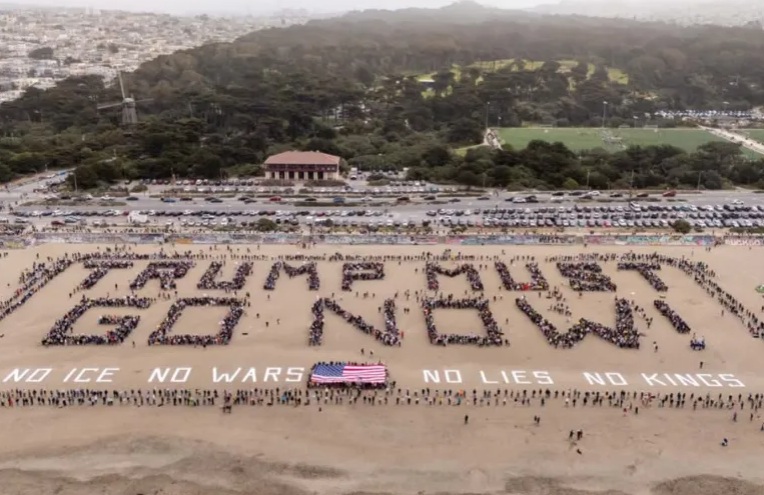 شهدت مدينة سان فرانسيسكو بولاية كاليفورنيا تحركًا احتجاجيًا لافتًا، حيث تجمع مئات المتظاهرين على شاطئ أوشن بيتش ونظموا أنفسهم في تشكيل بشري متناسق لتكوين عبارة باللغة الإنجليزية تدعو إلى رحيل الرئيس الأمريكي دونالد ترمب، في رسالة مباشرة تعكس تصاعد الغضب الشعبي.