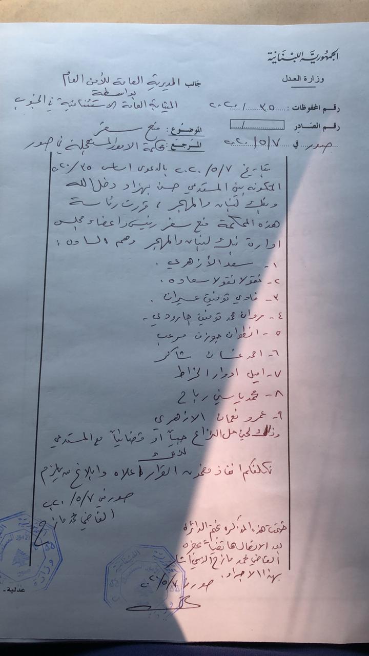 أصدر قاضي الأمور المستعجلة في صور محمد مازح امس قرارا معجل التنفيذ على أصله قضى بمنع سفر رئيس وأعضاء مجلس إدارة ومدير عام بنك لبنان والمهجر وذلك لحين حل النزاع حبيا او قضائيا مع المستدعي وكلف المديرية العامة للأمن العام بتنفيذه.
