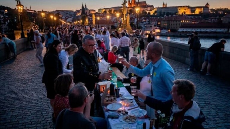 وشارك آلاف التشيكيين في براغ بحفل العشاء الجماعي على طاولة طولها 500 متر، احتفالا بتخفيف قيود الحجر الصحي إثر انتشار وباء كورونا.